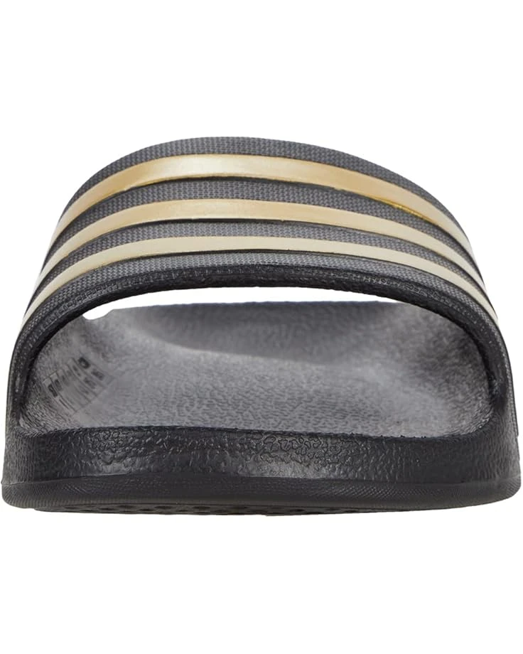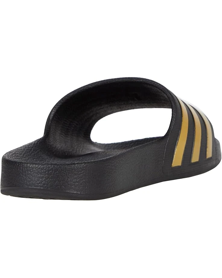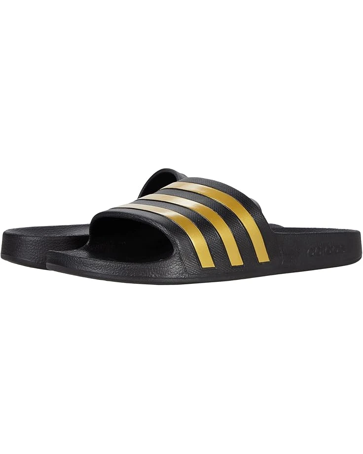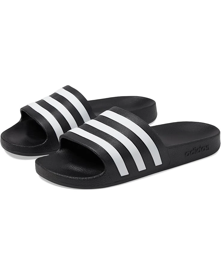 - adidas® Adilette Aqua Slides feature a classic slip-on style slide with three stripes.