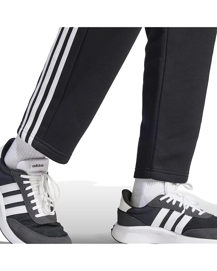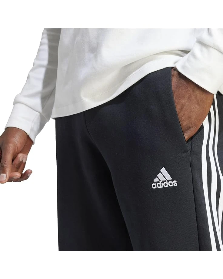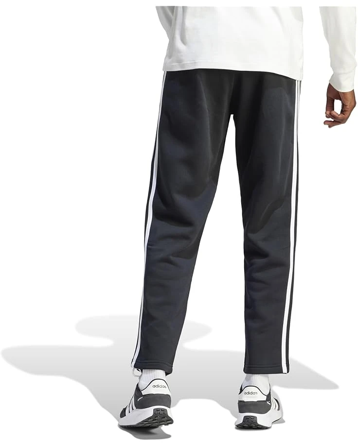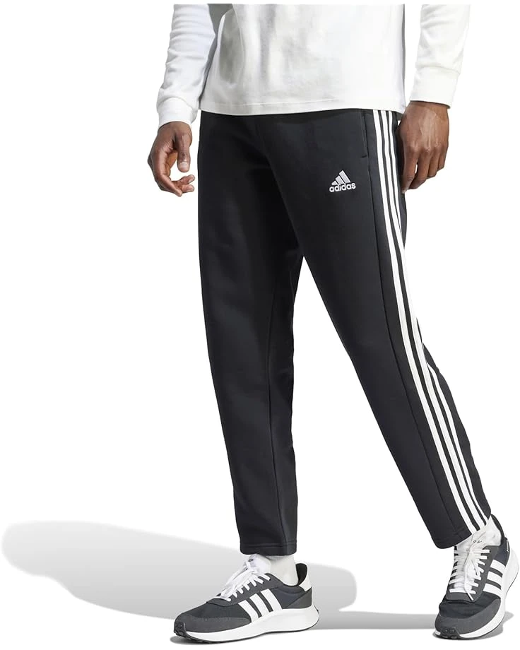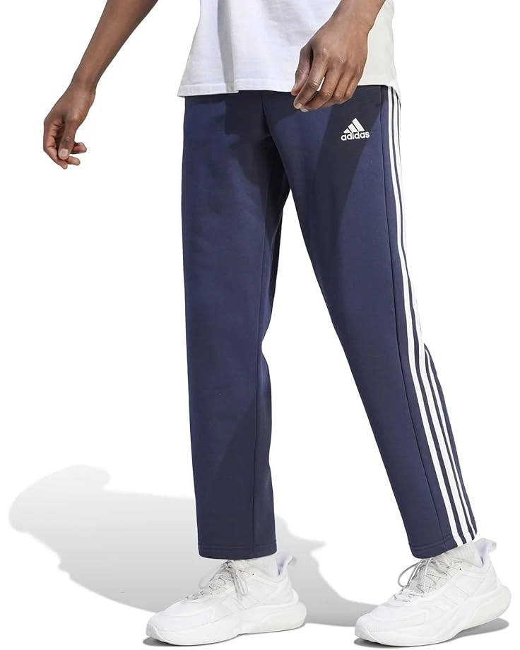 - You know how your weekends could be perfectly comfy yet stylish wearing the classic adidas® Essentials Fleece Open Hem 3-Stripes Pants. Featuring iconic stripes along the sides, these relaxed fit bottoms have the perfect mid-rise silhouette and elasticized waist with an adjustable drawcord.