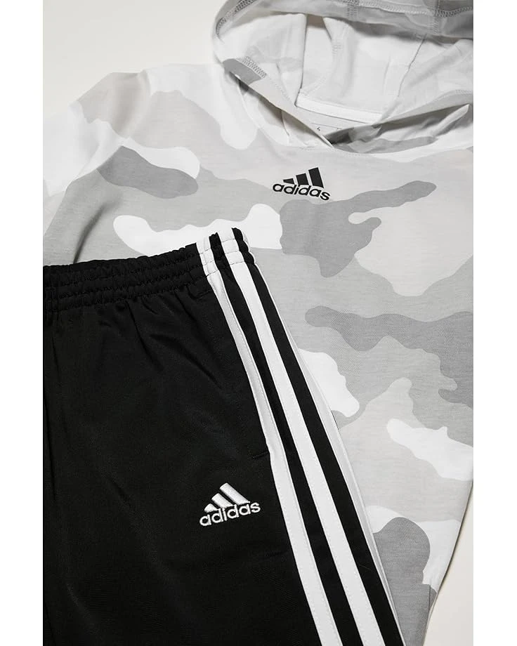 - Get ready for non-stop action wearing the adidas® Kids AOP Hooded Tee Pants Set! Featuring a sleek hooded tee with long sleeves and sporty track pants, this set offers a regular fit and tapered leg for a stylish, athletic look. The elasticized waistband ensures all-day comfort, while the easy-care fabric makes cleanup a breeze. Perfect for your little one’s busy day of play, this outfit is designed to keep up with their every move.