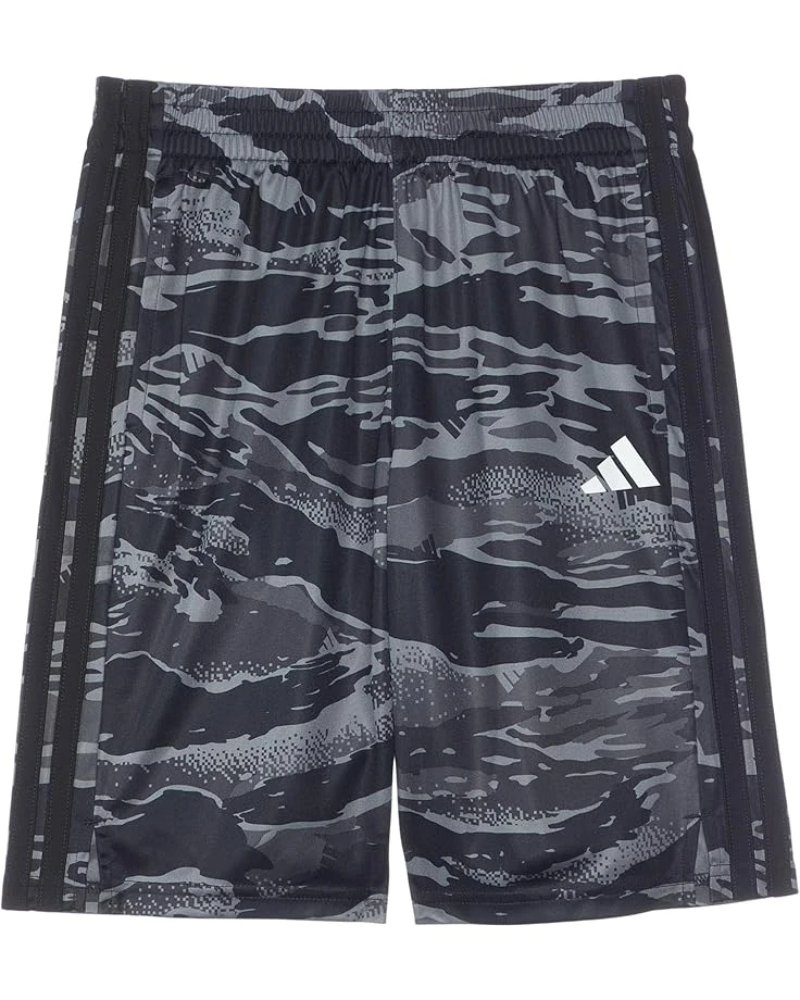 - Stand out from the crowd with your cool yet comfortable style wearing adidas® Kids AOP Tiger Camo Shorts. Crafted in an above-the-knee silhouette with a soft knit fabric, the pull-on style shorts are a must-have in your wardrobe. These feature a mid-rise elasticated waistband, two seamed pockets on the front, signature three-stripe detail, an allover camouflage print, and an adidas® logo detail on the front.