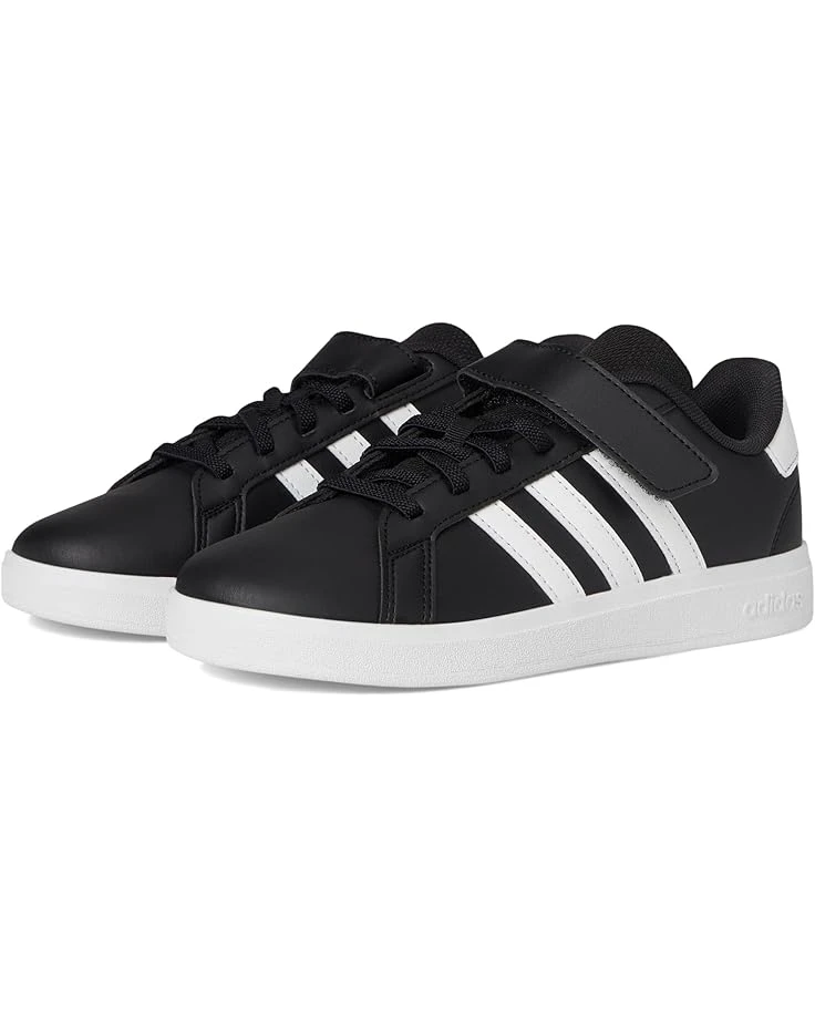 - Step into style sporting the adidas® Kids Grand Court 2.0 Shoes: where faux leather upper meets playground chic. Featuring a durable synthetic rubber lining for all-day comfort and a secure hook-and-loop closure for easy on/off wear. The robust rubber outsole ensures superior grip, while the lace design adds a touch of sporty sophistication.