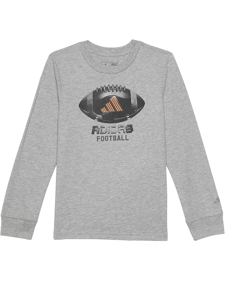 - Not your basic adidas T-shirt. A striking graphic design on this adidas® Kids graphic LS heather tee makes sure that he’ll stand out from the competition. Silky soft jersey seals the deal. It features a crew neckline, long sleeves, and a straight hem.