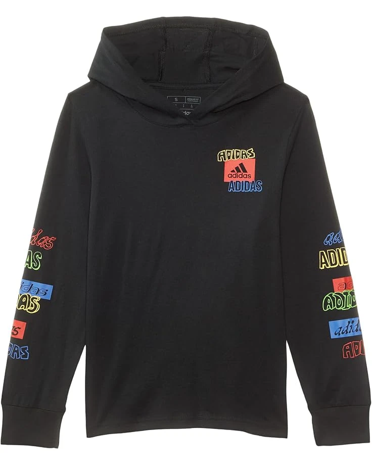 - The adidas® Kids Hooded Lineage Stack Long Sleeve Tee combines the casual ease of a T-shirt with the snug coverage of a hoodie. Its lightweight fabric ensures effortless comfort, while the regular fit and long sleeves allow freedom for every adventure. Perfect for all-day versatility, this pull-on tee is built to handle active kids on the move. The hooded neck adds a sporty edge, and bold screen-printed adidas typography along the sleeves brings iconic style.