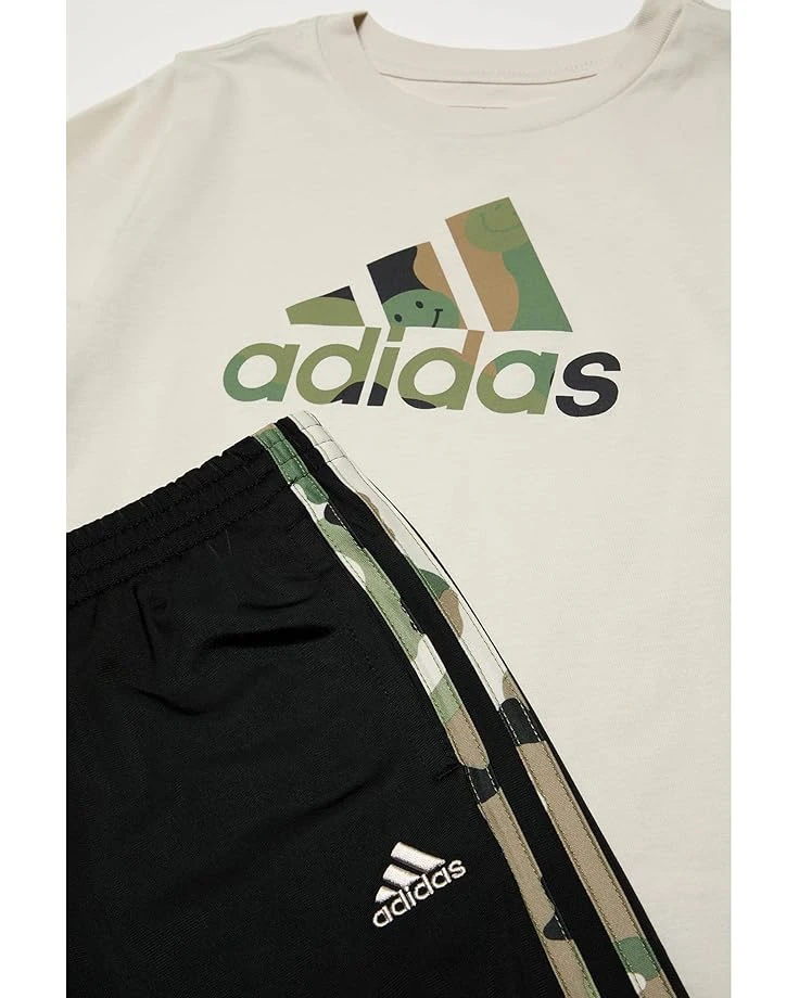 - Cool, comfy, and ready to move! This adidas® Kids Long Sleeve Cotton Tee Tricot Jogger Set blends sporty style with all-day comfort. The top with camo 3-Stripes and crew neck pairs perfectly with mid-rise tricot joggers, featuring an elasticized waist and cuffed legs for a snug fit. The seam pockets add functional flair, while the flat front design keeps the look sleek. Whether it’s playtime or downtime, this regular-fit set keeps kids stylish and active in every mode.