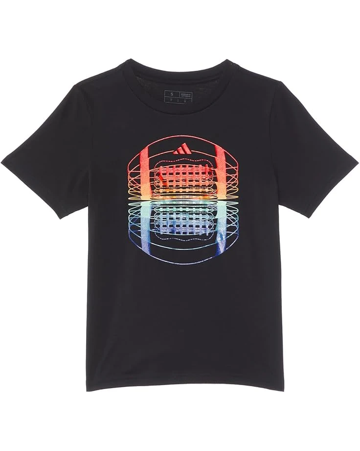 - Switch your kid’s old and boring t-shirts with Adidas® Kids SS Football Tee. Having an attractive, high-quality screen print with a gradient effect, this short-sleeved t-shirt has an Adidas performance logo at the front. The pull shirt also has a round neckline, regular length, a straight hem, and a regular fit silhouette.