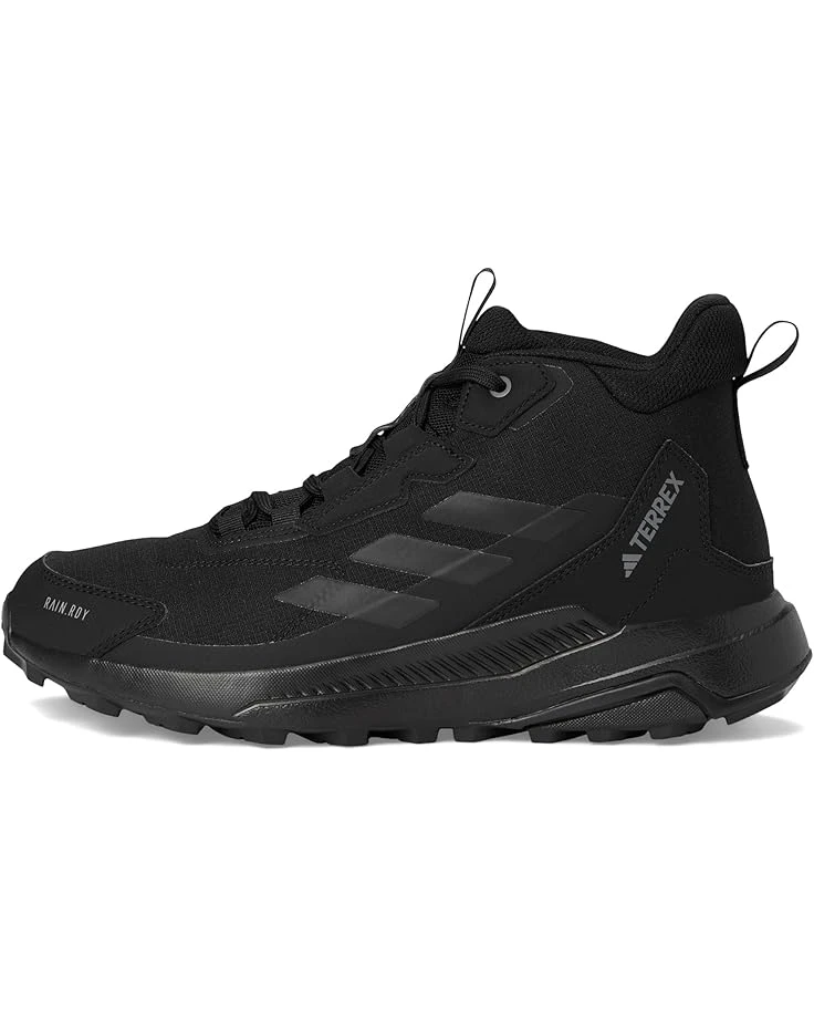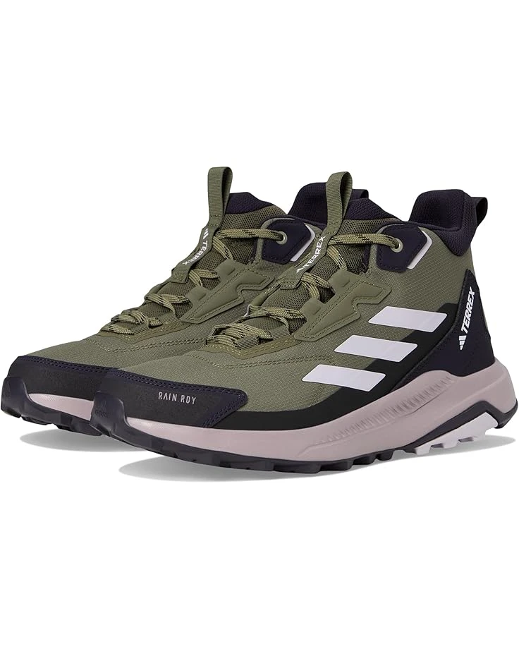 - Wander freely, roam boldly, and explore without limits in the adidas® Outdoor Terrex Anylander Mid RAIN.RDY Hiking Shoes. Designed for every trail and terrain, these mid-height hikers combine a rugged rubber upper and durable Traxion rubber outsole for unmatched grip on slippery surfaces. The RAIN.RDY technology and gusseted tongue shield your feet from rain and puddles, ensuring dry comfort in wet conditions. A cushioned midsole supports your every step, while the natural rubber lining enhances breathability. Crafted with recycled materials, these shoes tread lightly on the planet, blending eco-conscious innovation with trail-tested performance. Lace-up and chase the horizon!