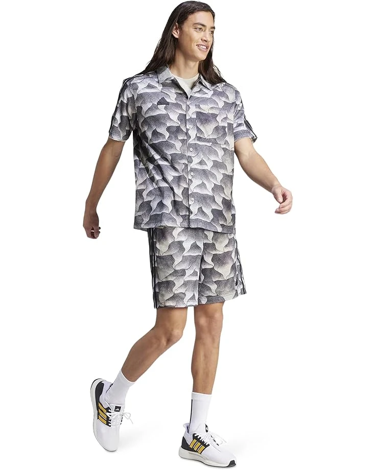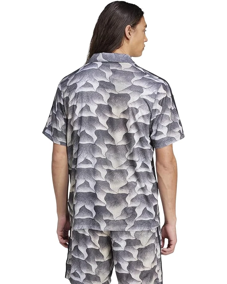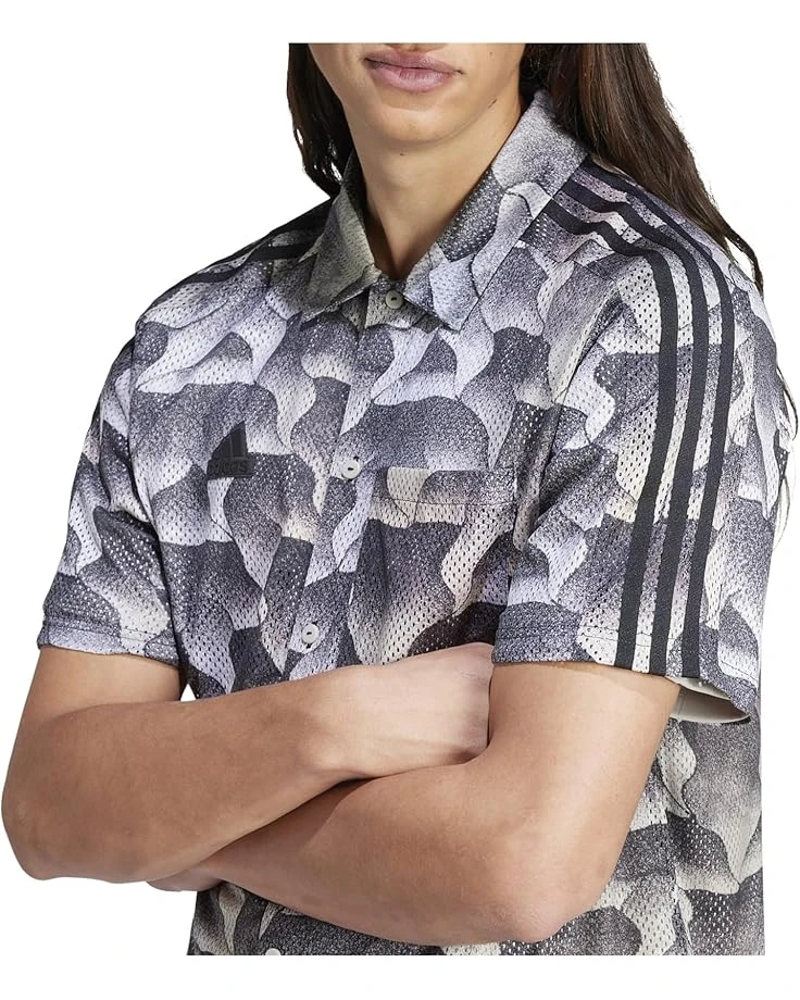 - The adidas® Tiro All Over Printed Mesh Resort Shirt is a perfect choice for casual outings and beach vacations. Crafted from breathable fabric that keeps you cool and comfortable, this printed shirt takes your comfort to the next level. The buttoned front closure offers easy wear. This button-down shirt comes with short sleeves and a polo collar. Fill your day with colors and fun by wearing this casual shirt.
